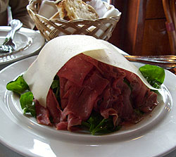 薄切りの牛、そして薄いパルメザンチーズのシートがのっかっています。