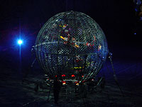 球状のカゴ(と呼べばいいんでしょうか)の中を数台のバイクが