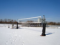 手前にあったバレーボールコートもその横にあるバスケットボールコートも、雪だらけ。