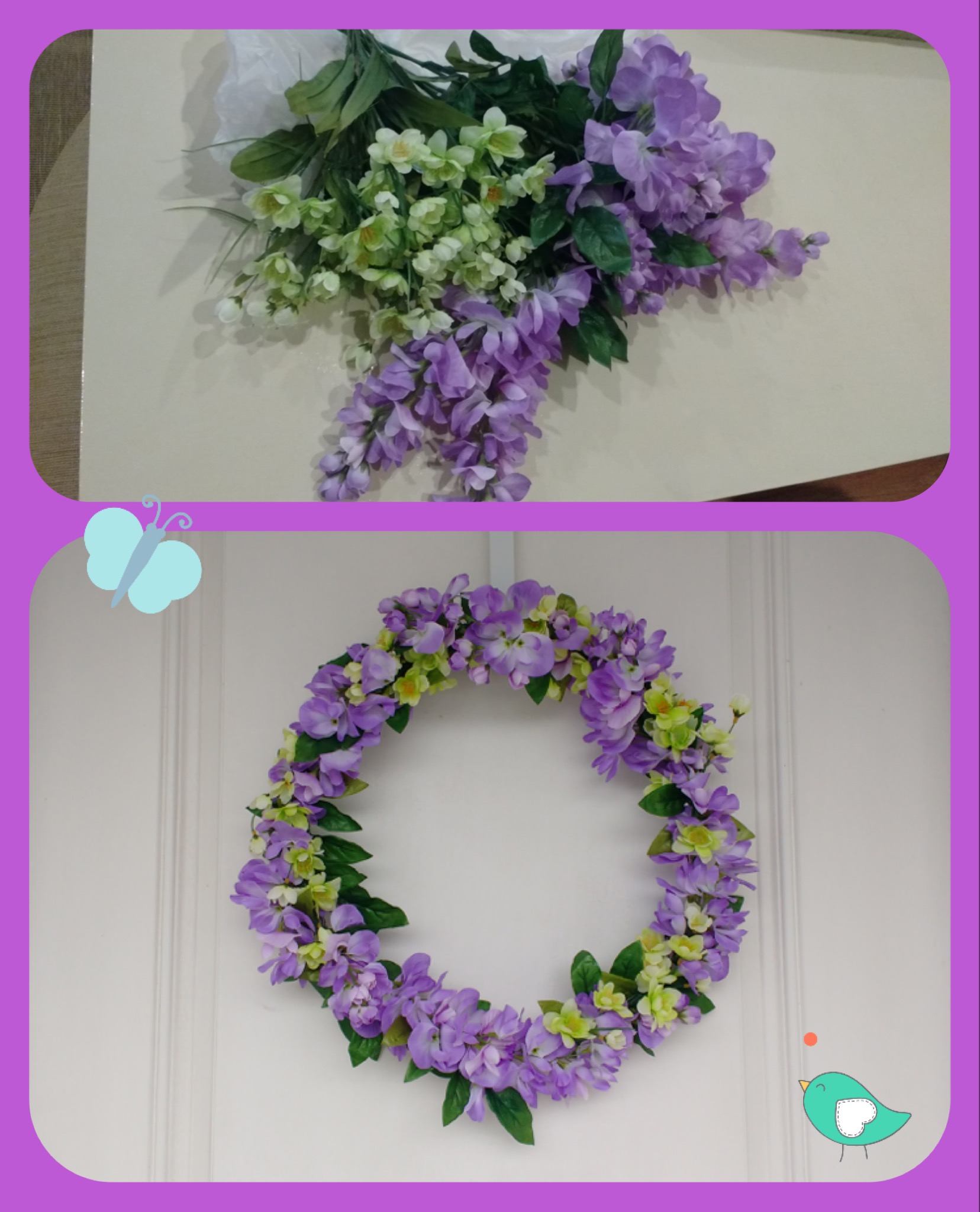 写真上の造花をハサミで分解したものを、手持ちのリース用リングに少しずつ細い針金で固定していきます。
