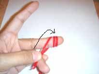 矢印の方向に、指に毛糸を2回巻きつけます。手前側が糸端。