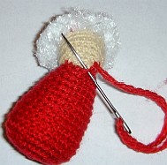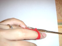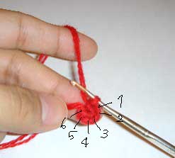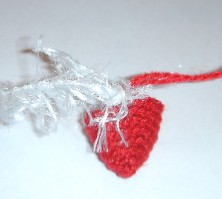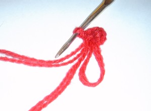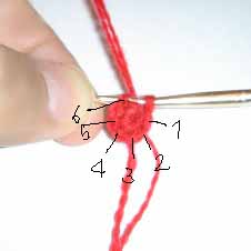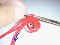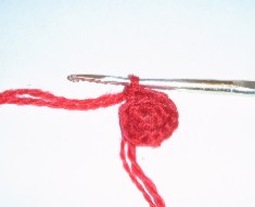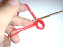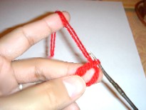 そこから2、3目鎖編みを編んで、赤い糸をすくって編んで、