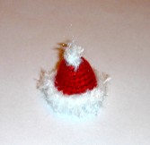 この帽子は、まず赤でてっぺん部分から編んで、裾の白部分を編んで、