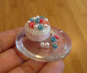 それを土台にして、白とピンクで編んだケーキに、粘土で作ったバラと、パールのビーズを貼り付けました。