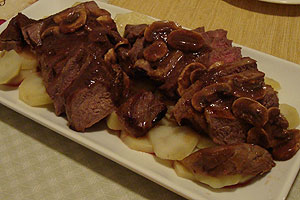 肉を焼き上げたフライパンに漬け汁と赤ワインとスライスしたマッシュルームを入れて煮詰め、