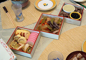 何となく御節っぽく見えればいいなぁ、で纏めてみました。蒲鉾と黒豆は既製品です。