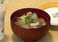 鶏肉のお出汁に、大根と人参と三つ葉とナルト、そしてお餅が入っています。